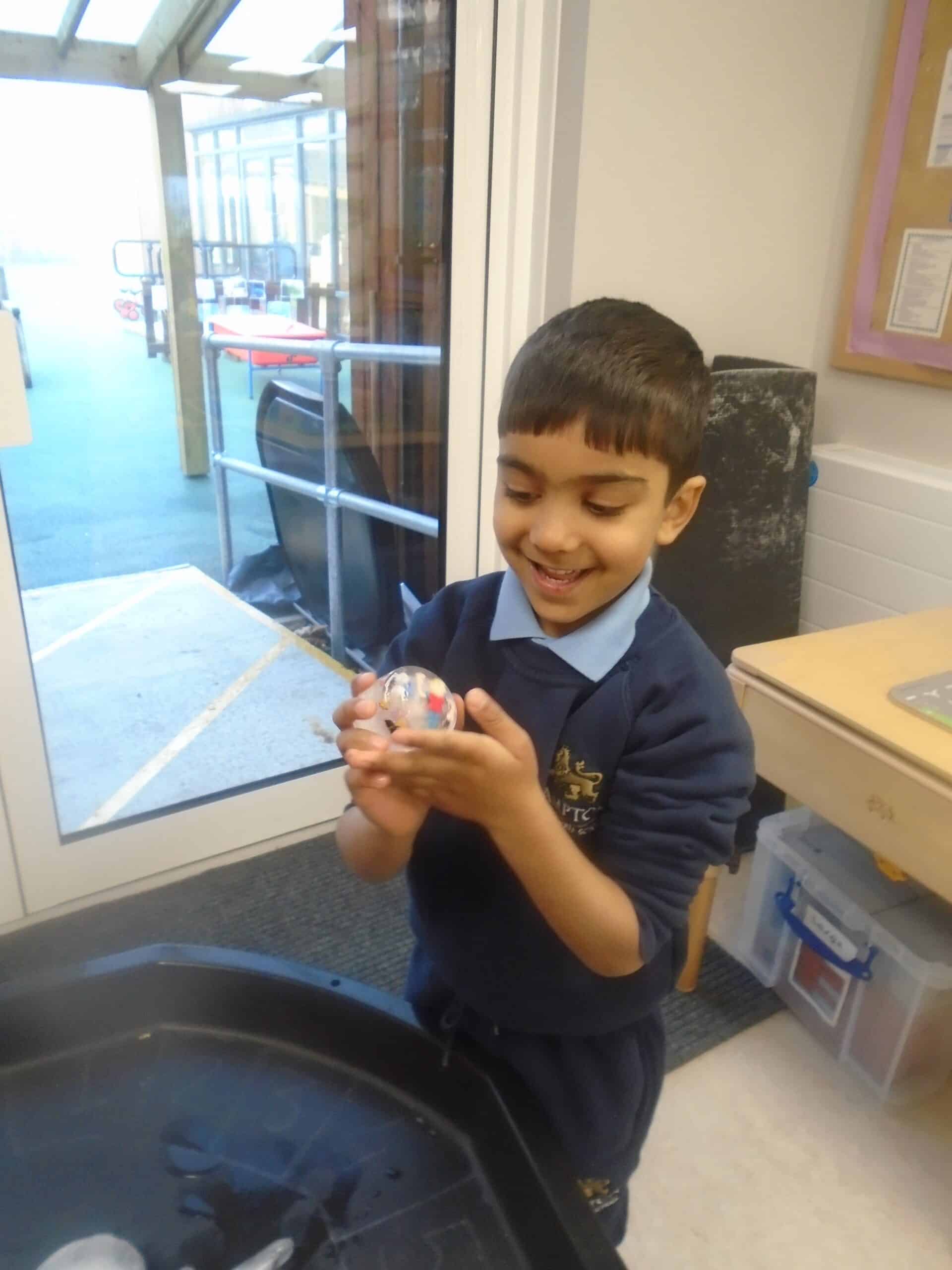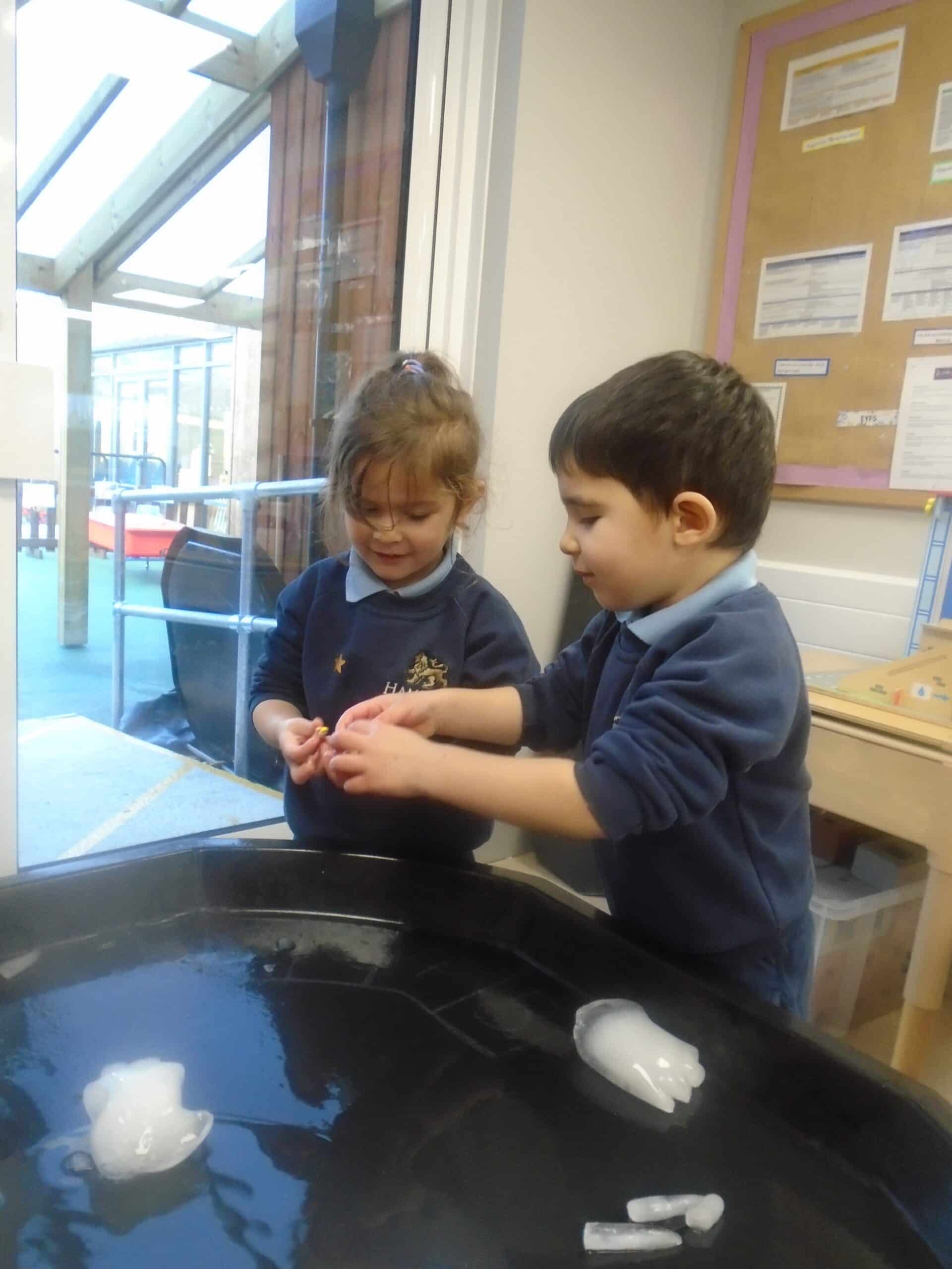 Our theme also sparked an exciting science investigation. Together, we explored how frost and ice form, and many of the children shared that water needs to freeze to become ice. We filled plastic pots with people in and gloves with water, placing some in the freezer overnight and one in our garden to observe the changes. The next morning, we had fun exploring the ice and using it in our polar small world play. While the glove in our garden didn’t freeze, the children observed how cold it was and decided to keep an eye on it to see if it freezes later.